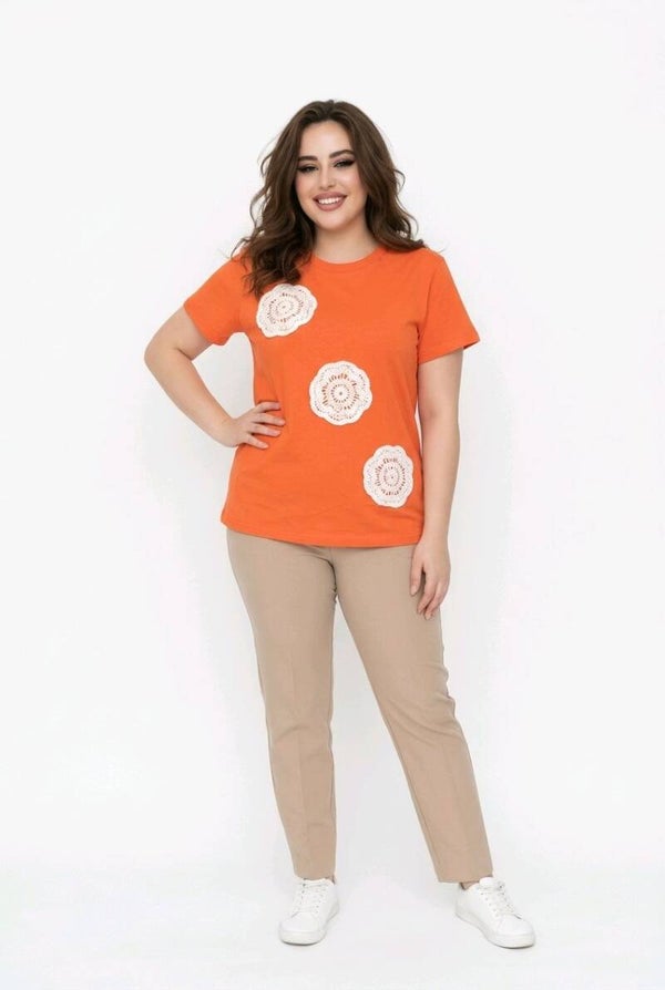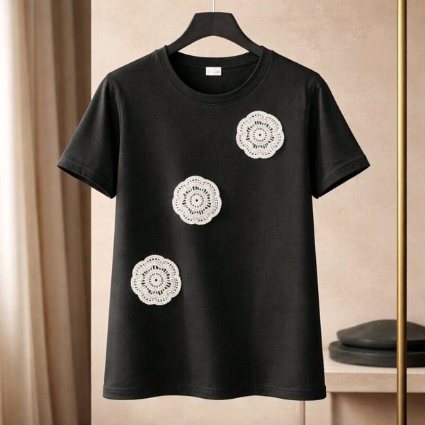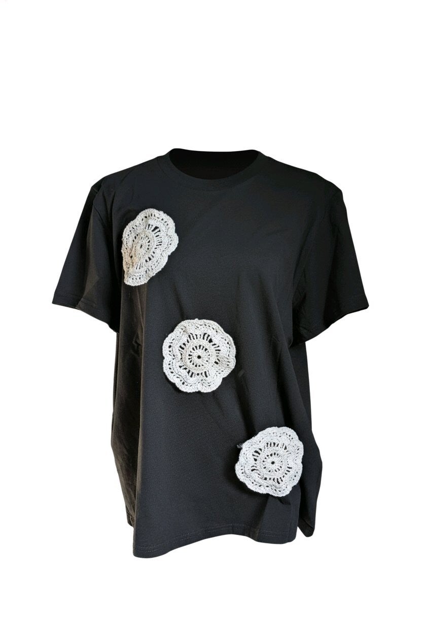 Mooi T-shirt met gehaakt motief in verschillende kleuren en maten te verkrijgen.
